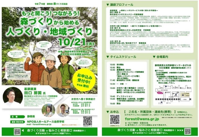 - 県では、県民参加による森づくりを促進するため、森づくり団体等が情報交換や課題の共有ができる「森づくり交流会」を開催します。