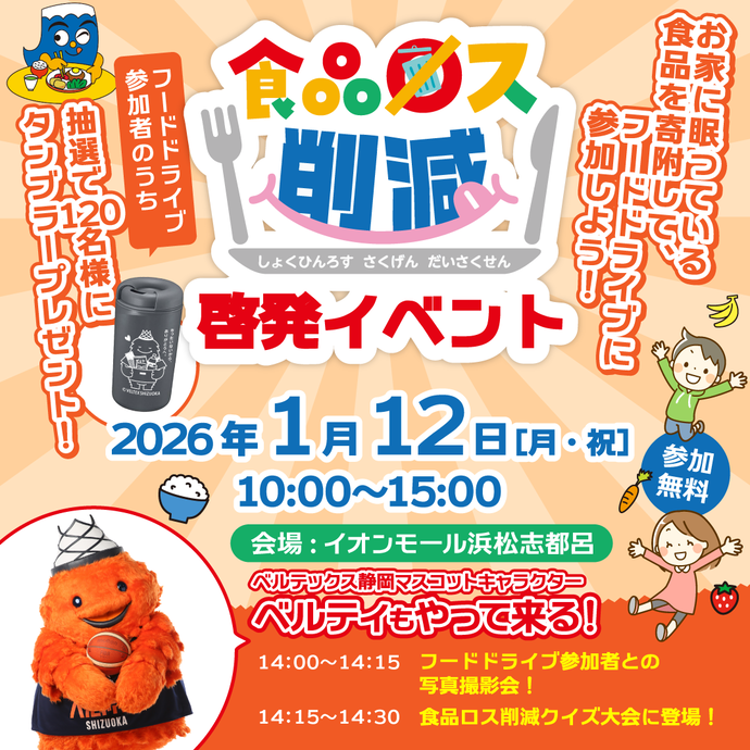 さらに!14時00分~14時15分には、ベルテックス静岡マスコットキャラクター「ベルティ」とフードドライブ参加者との写真撮影会を開催します!ぜひ御参加ください!